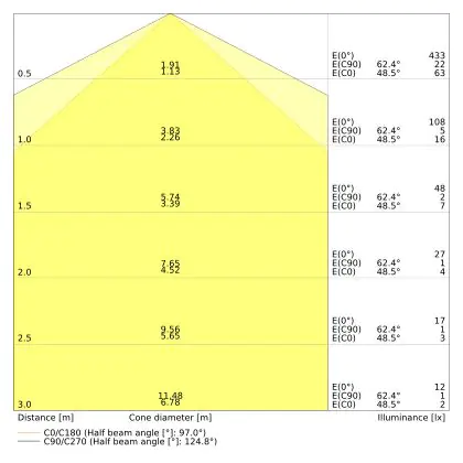 ![]() De kleurcode is een combinatie van de kleurweergave (CRI) en lichtkleur (Kelvin). Het eerste getal is de kleurweergave (1 = zeer slechte kleurweergave, 9 = maximale kleurechtheid). Het tweede en derde cijfer betreft de lichtkleur. Een lamp met kleurcode 830 heeft bijvoorbeeld een goede kleurweergave en straalt een warm wit licht uit (3000K), waar een lamp met de kleurcode 940 een uitstekende CRI heeft en een koel wit licht (4000K) uitstraalt. |