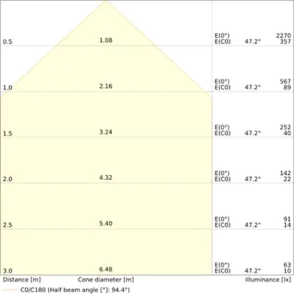 De gradenbundel geeft informatie over hoe breed het licht wordt uitgestraald. Dit zit tussen de 0 en 360 graden (D). Hoe kleiner de hoek, hoe specifieker de lichtbundel is. Over het algemeen is een smalle gradenbundel perfect voor sfeer- of accentverlichting, terwijl een brede gradenbundel ideaal is om grote oppervlaktes te verlichten.