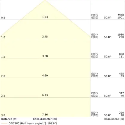 De gradenbundel geeft informatie over hoe breed het licht wordt uitgestraald. Dit zit tussen de 0 en 360 graden (D). Hoe kleiner de hoek, hoe specifieker de lichtbundel is. Over het algemeen is een smalle gradenbundel perfect voor sfeer- of accentverlichting, terwijl een brede gradenbundel ideaal is om grote oppervlaktes te verlichten.