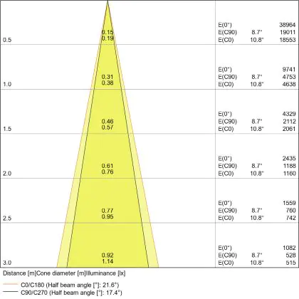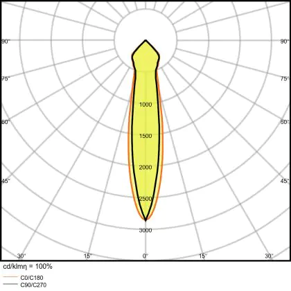 De lichtopbrengst en de gradenbundel spelen een grote rol. Zo geeft de lichtopbrengst van 3550 Lumen in combinatie met de 24° stralingshoek deze inbouwspot een specifieke toepassing. Kort samengevat is een lichtintensiteit van maximaal 400 Lumen ideaal voor accentverlichting, terwijl hogere waardes goed gebruikt kunnen worden als basisverlichting. Over het algemeen geldt: hoe breder de gradenbundel, hoe geschikter deze is door basisverlichting. Dit komt doordat het licht over een groter oppervlak wordt verspreid. Smallere gradenbundels (tot 40°) kunnen echter bij hoge plafonds ook goed tot hun recht komen als algemene verlichting.