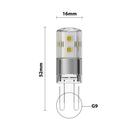 Om tot de meest geschikte G9 LED steeklamp te komen, is het handig om een aantal dingen te checken. Te beginnen met de kleurtemperatuur. Die is bij dit product: 2700K - Zeer Warm Wit. Wil je liever een andere kleurtemperatuur? Gebruik dan het filter 'Lichtkleur' aan de linkerkant van onze G9 LED Lampen pagina. Ook raden we aan om altijd de afmetingen van dit LED product te vergelijken met je huidige G9 lamp. De diameter is: mm en de hoogte is: 52mm.
