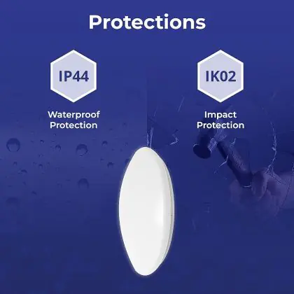Een belangrijk element van LED plafondlampen is de IP waarde. Dit getal geeft de mate van bescherming aan tegen binnendringen van stof en vocht/water. Vanaf IP65 is het stof- en waterdicht. De IP waarde van deze LED plafondlamp is: IP44 - Stof- en Spatwaterdicht. Ben je op zoek naar een LED plafondlamp voor buitengebruik? Dan voldoet een product met een IP44 waarde (spatwaterdicht) al. Meer baat bij een product met een ander IP waarde? Klik dan hier voor ons complete assortiment aan LED plafondlampen en gebruik het zoekfilter 'IP waarde' aan de linkerkant van de pagina. Let bij het plaatsen van een LED plafondlamp in de buitenlucht ook op de IK waarde (slagvastheid). De IK waarde van deze LED lamp is: IK02 - 0.20 Joule.