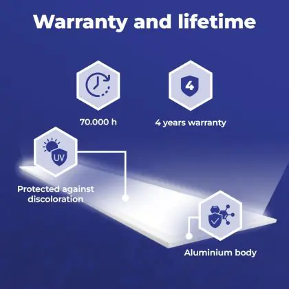 Met de aanschaf van dit LED paneel van 120x30cm maak je in meerdere opzichten een goede keuze. Met een gemiddelde levensduur van 70000 uur ben je verzekerd van een duurzaam product, dat vele jaren optimaal blijft presteren. Bovendien draag je een steentje bij aan een schoner milieu, want LED verlichting vermindert de C02 uitstoot en bevat geen giftige stoffen zoals kwik.